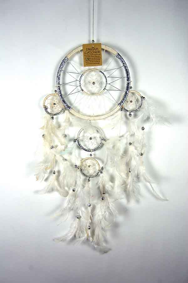Dream Catcher Nylon Cream And Silver 3 Circles And Two Mini Circles With Feathers 16CM