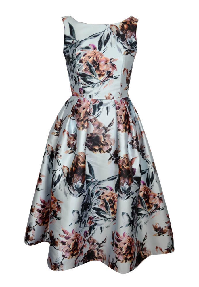 Dress Long White Large Floral Print Poly Silk Retro Rockabilly Style