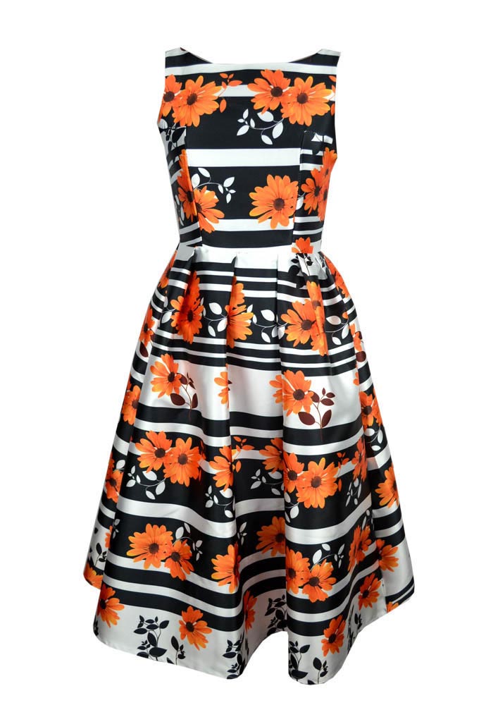 Dress Long White And Black Stripes With Yellow Flowers Poly Silk Retro Rockabilly Style