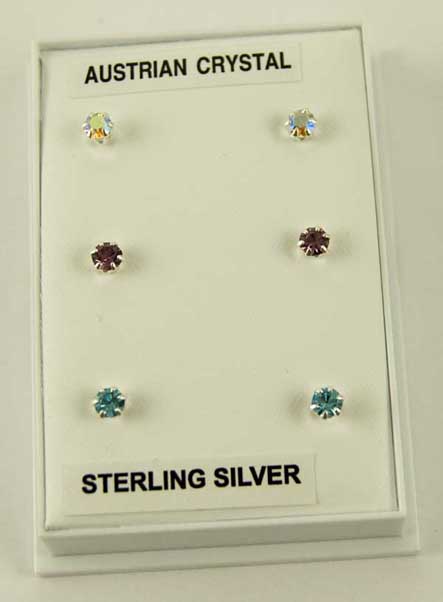 Earring Silver Stud 3 Pairs Of Claw Set Assorted Colour Austrian Crystal Stones Dia 4mm