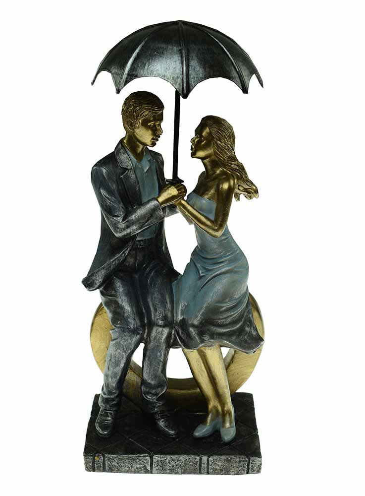 Figurine Couple With Metal Umbrella Sitting On Bench 11.5X9.5X26cm. Poly resin