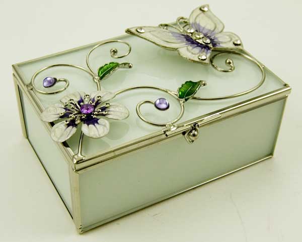 Jewellery Box White Glass With Metal Purple And White Butterfly And Flowers L10XW10XH4.2cm