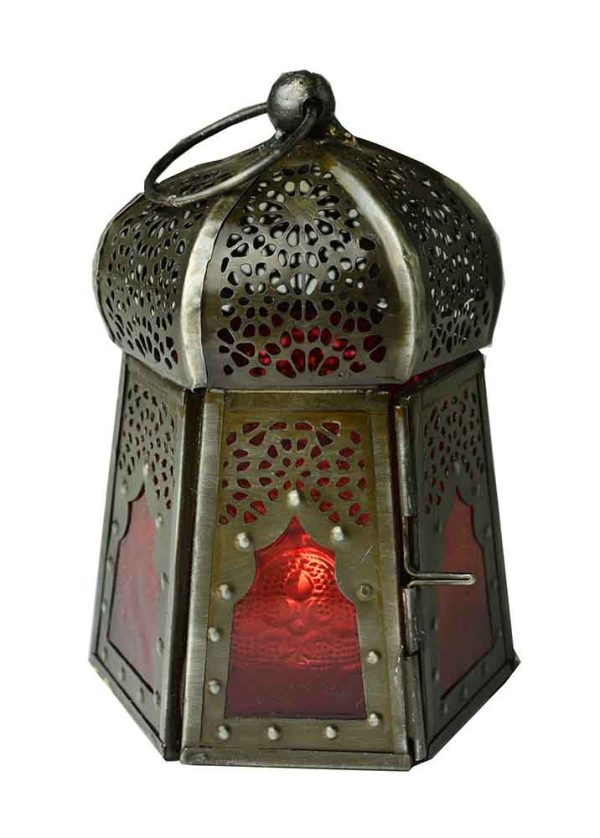 Lantern Candle Holder Mushroom Style Hexagonal Zinc Antique With Embossed Glass Red H12cm x W9cm