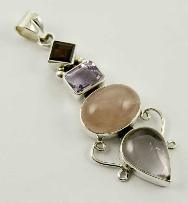 Pendant Silver 4 Stones Mixed With Rose Quartz Oval Centre Stones L5cm