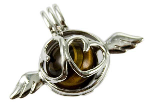 Pendant Wings And Hearts With 16mm Tiger Eye Ball Encased With Silver Plated Material