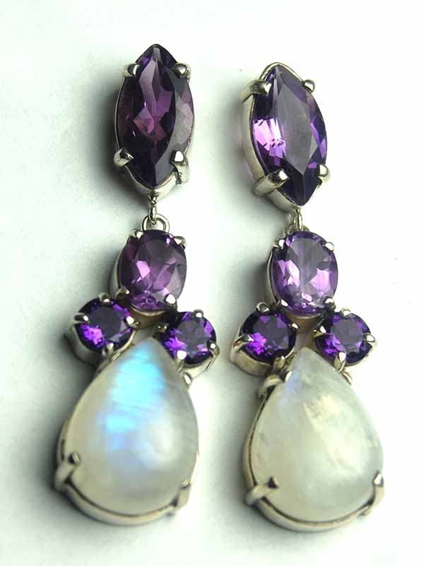 Earring Amethyst Stones And Moonstone Tear Drop L4.5cm 925 Sterling Silver