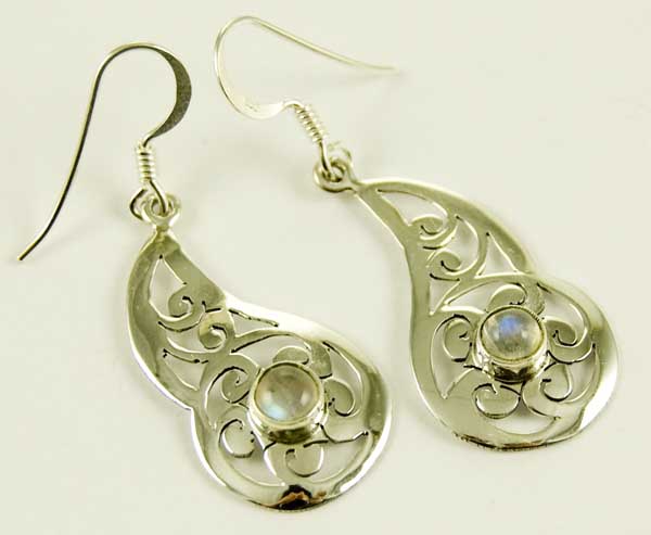 Earring Moonstone Cabochon Circle Stone Jali Style L4cm From The Top Of The Hook 925 Sterling Silver