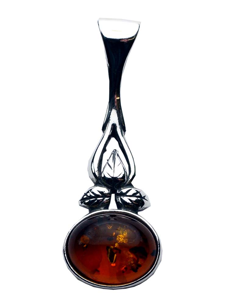 Pendant Amber Oval Cognac With Leaf Design L3cm Sterling Silver