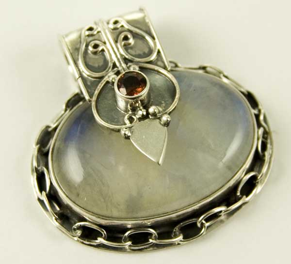 Pendant Oval Garnet And Moonstone Stone With Chain Link Border Size From Top W3.2cm 925 Sterling Silver