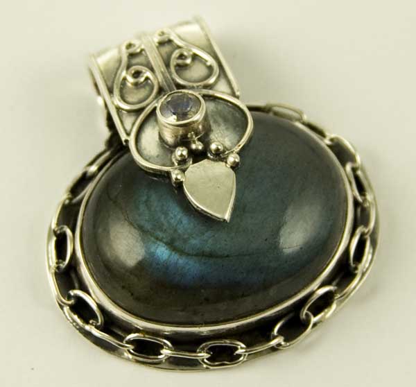 Pendant Oval Moonstone And Labradorite Stone With Chain Link Border Size From Top W3.2cm 925 Sterling Silver