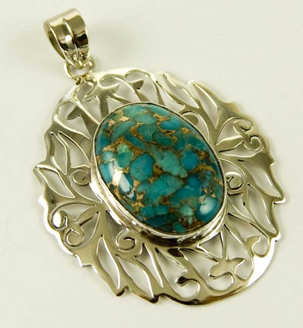 Pendant Fancy Oval Cut Border Cabochon Turquoise Stone Length From The Top 5cm 925 Sterling Silver