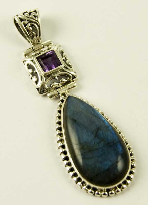 Pendant Tear Drop And Square Stone Amethyst And Labradorite With Pearly Border Size From Top L6cm 925 Sterling Silver