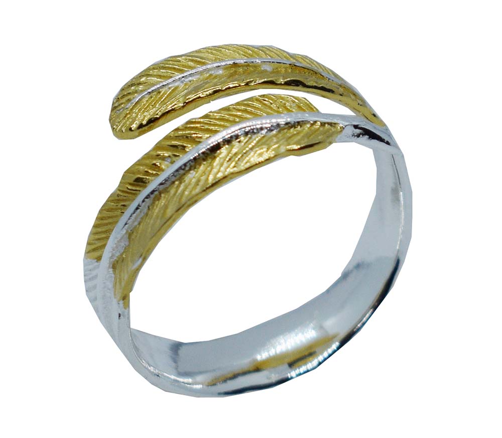Sterling Silver 925 Hallmarked Ring 2 Rows of Feathers 2 Tone Gold Plated