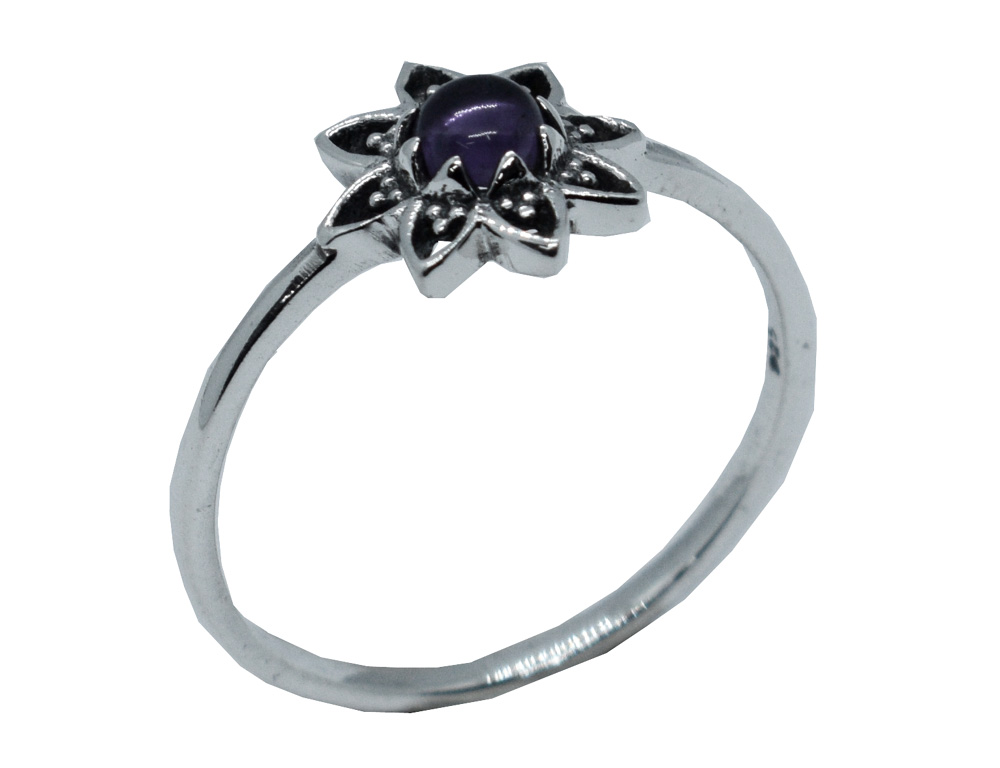 Sterling Silver 925 Hallmarked Ring Flower Design And A Roud Amethyst Stone