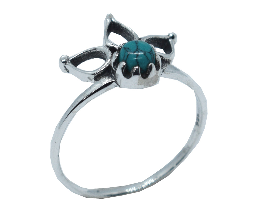 Sterling Silver 925 Hallmarked Ring Half Flower Design And A Roud Turquoise Stone