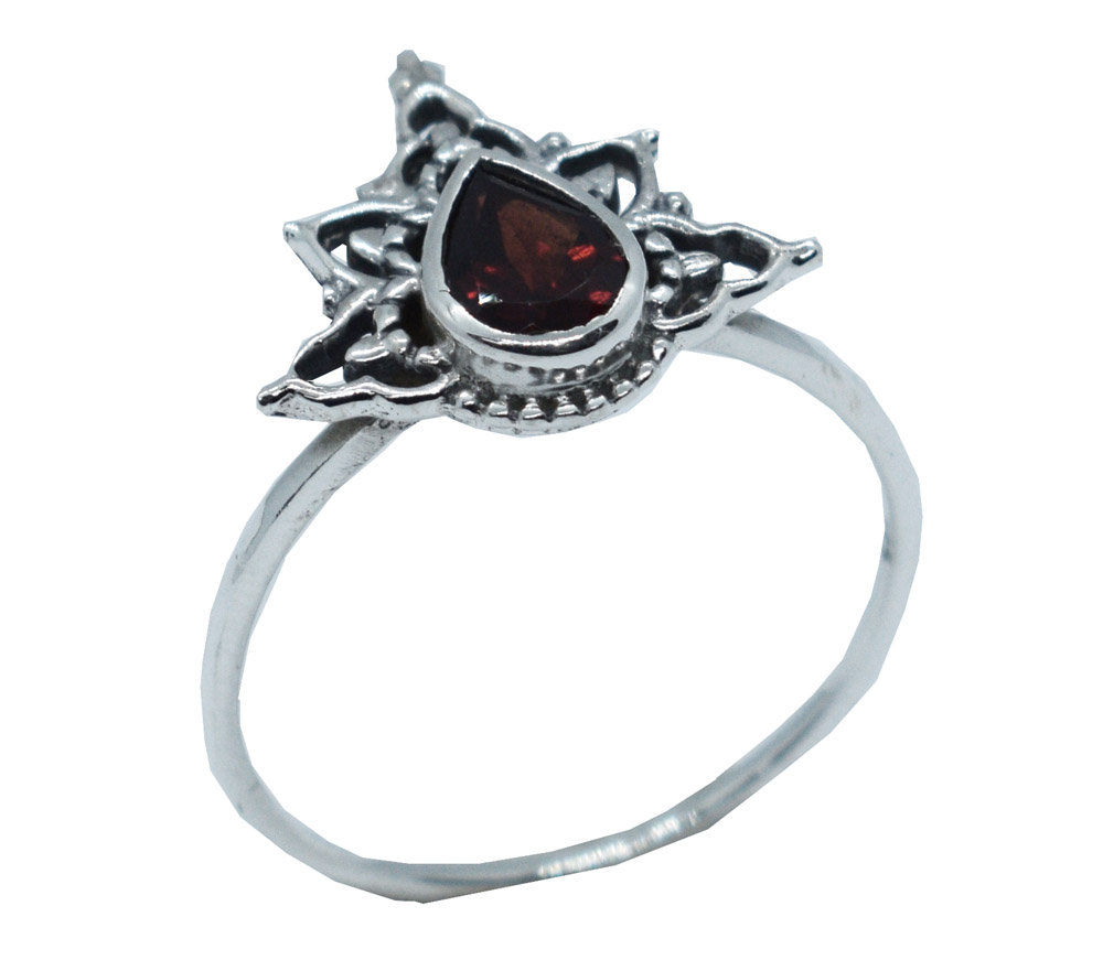 Sterling Silver 925 Hallmarked Ring Flower Design With Garnet Teardrop Stone