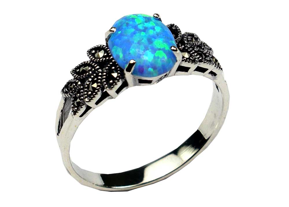 Ring Marcasite Oval Blue Fire Opal Stone With Stone Leaves At The Sides 925 Sterling Silver 925 Hallmarked