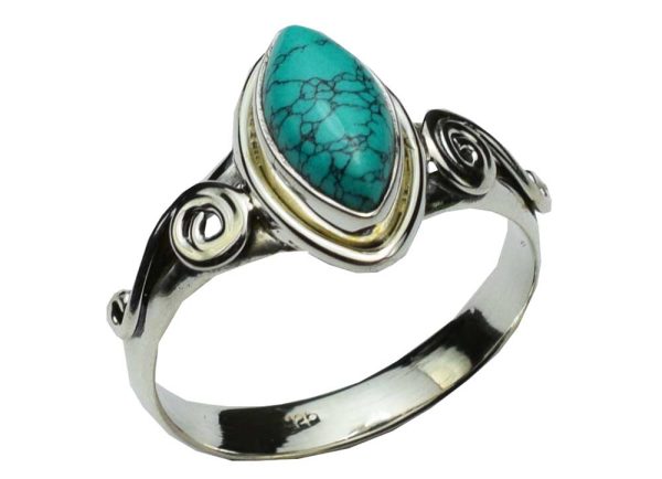 Ring Turquoise Cab Eye Shape Stone With Plain Border Swirl Cut Sides 925 Sterling Silver 925 Hallmarked