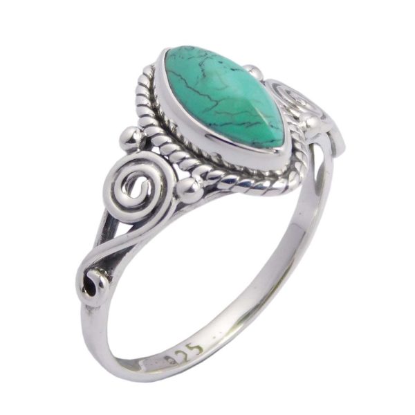 Ring Turquoise Eye Shape Raised Stone With Rope Style Border And Swirl Design At The Sides. Approx Weight Is 7 Grams 925 Sterling Silver 925 Hallmarked